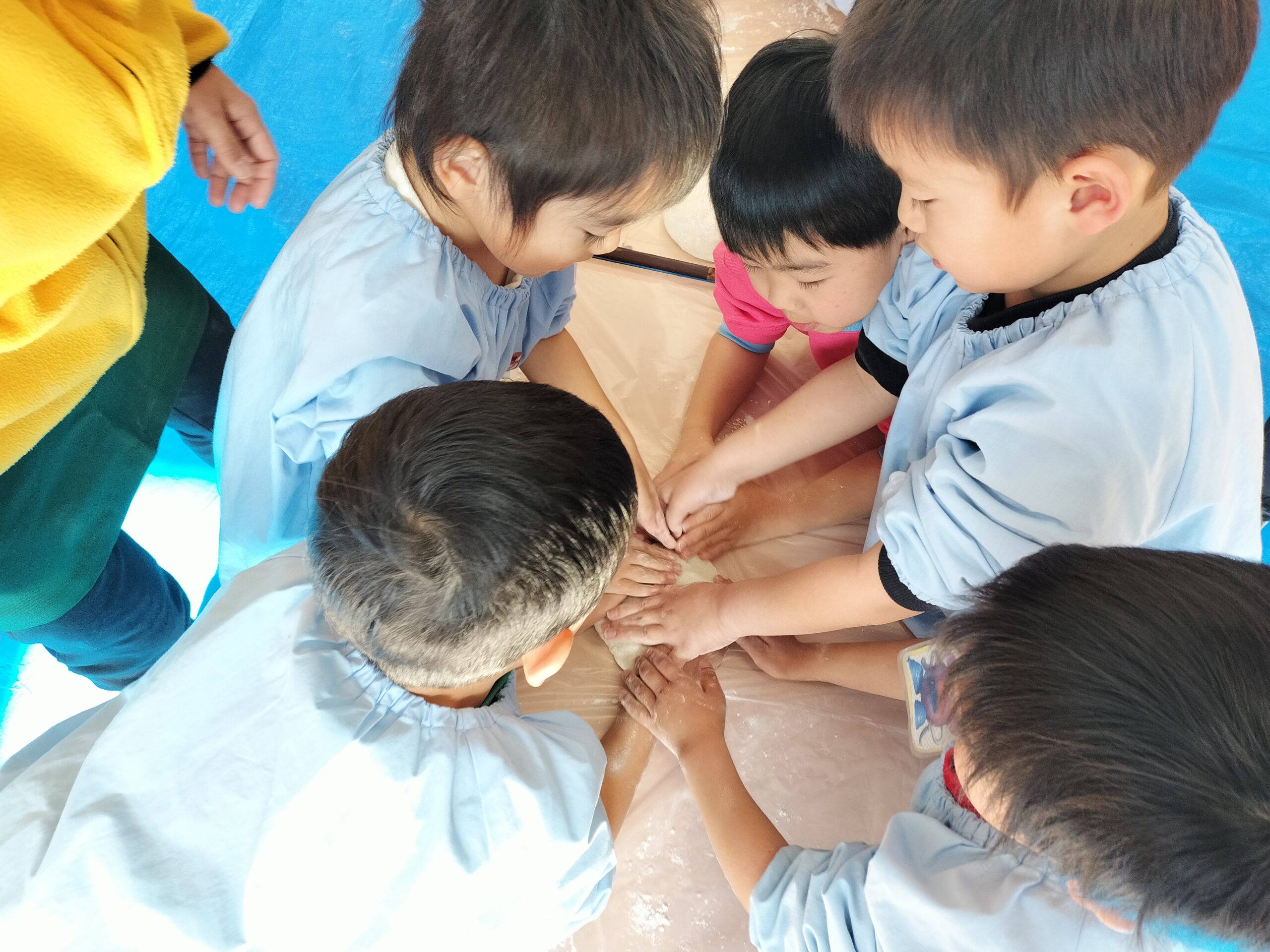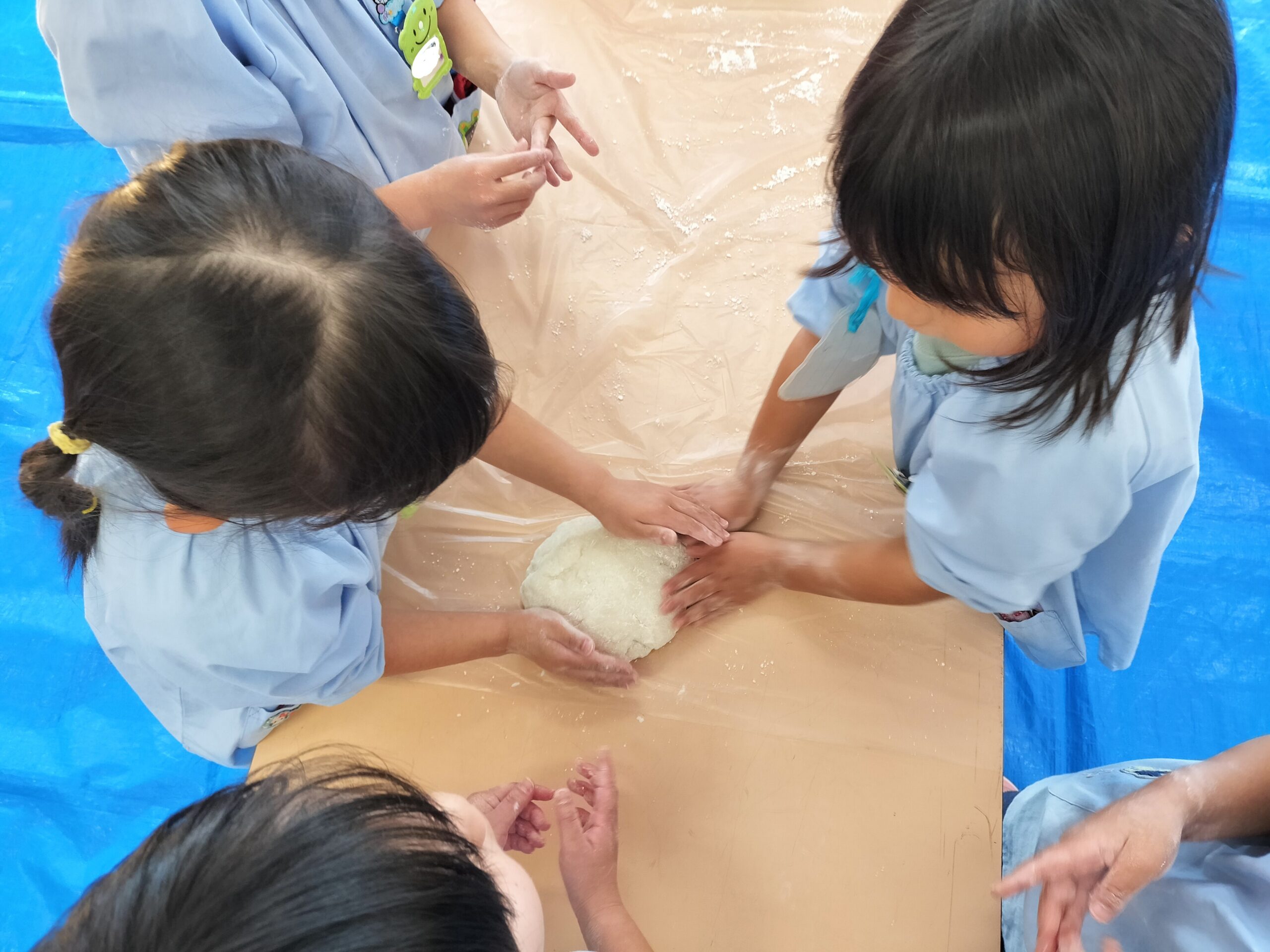 クラスで一つ、みんなで大きな鏡餅をコネコネと作りました!
