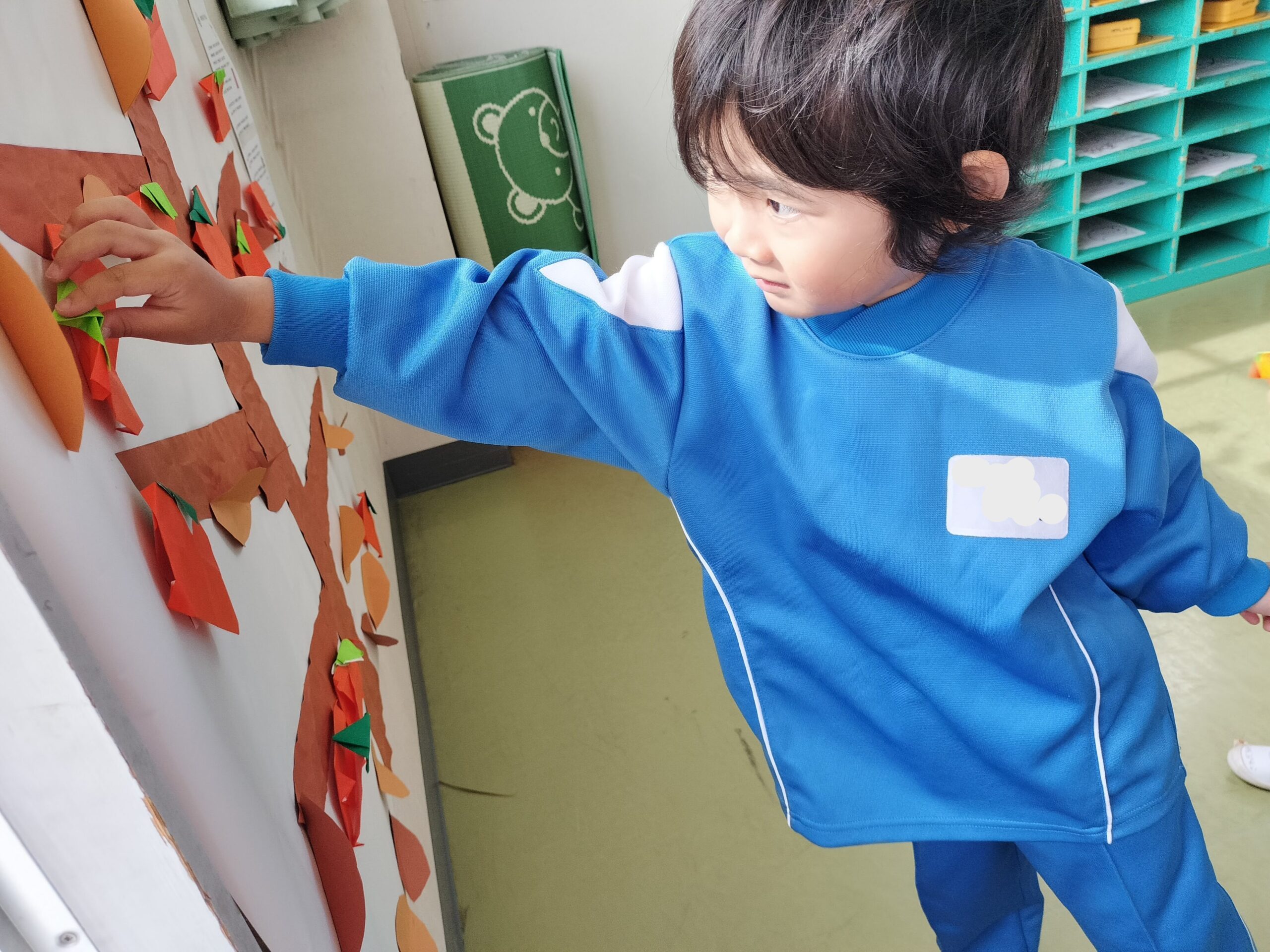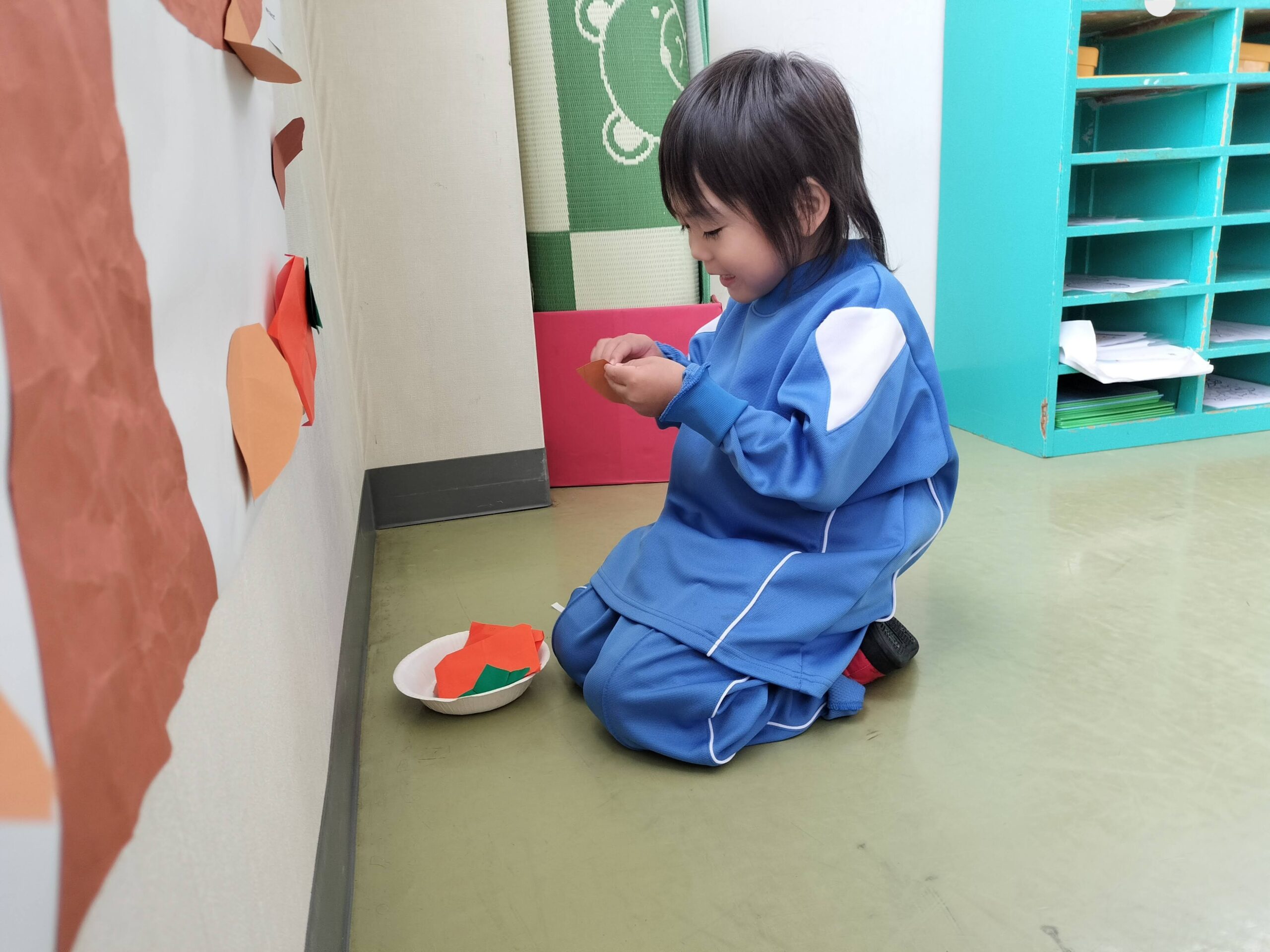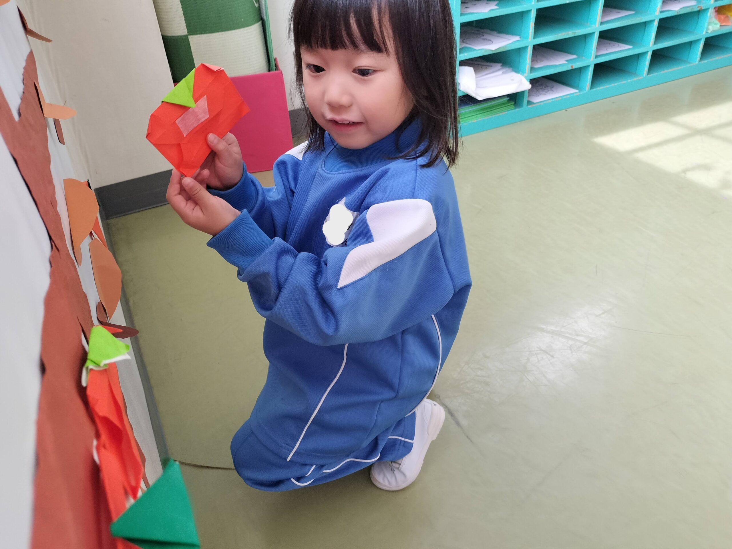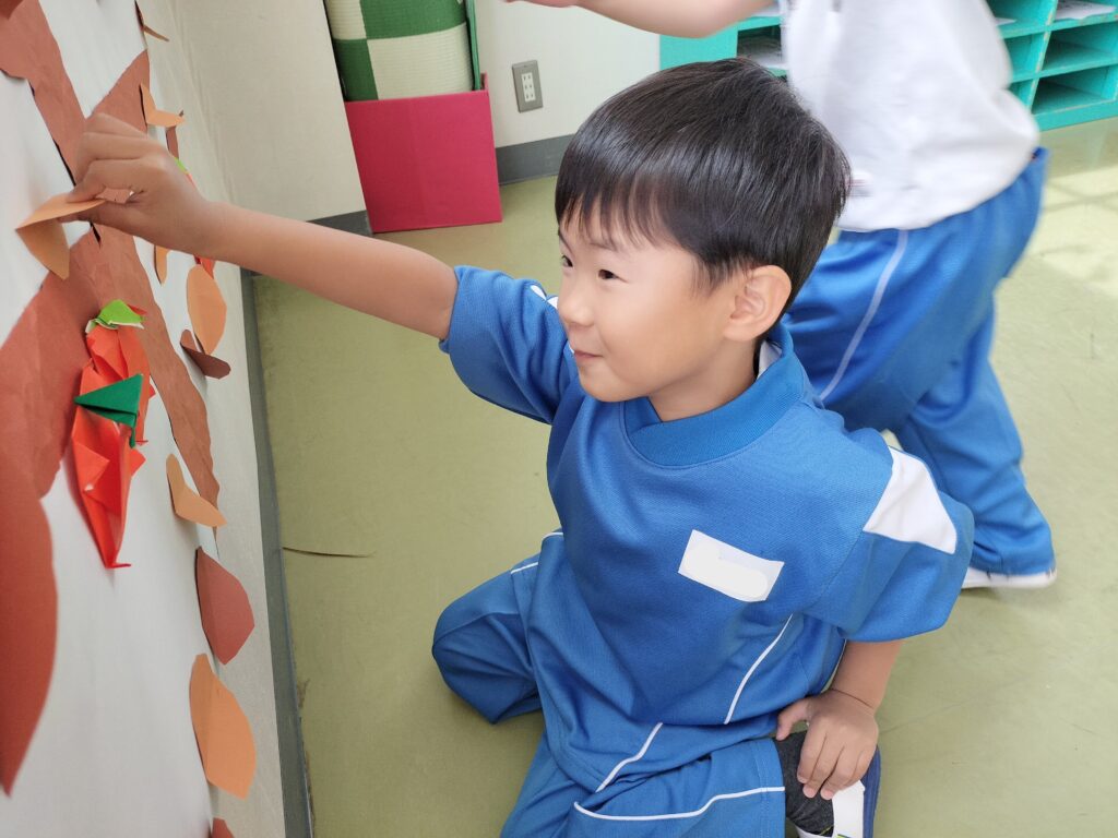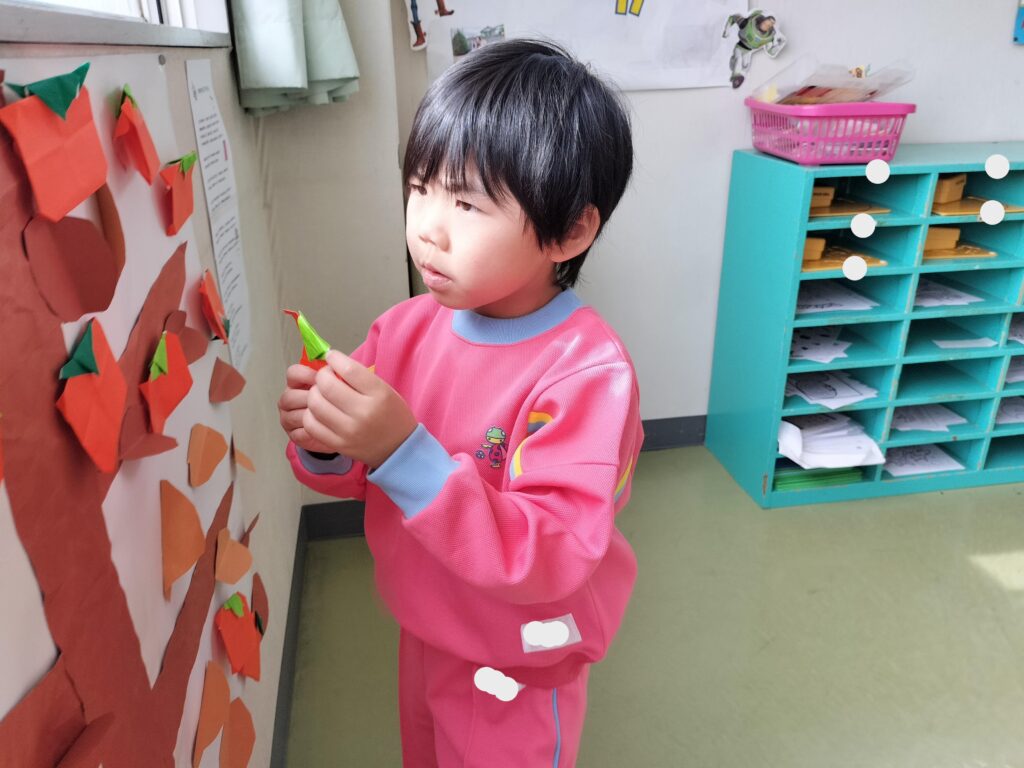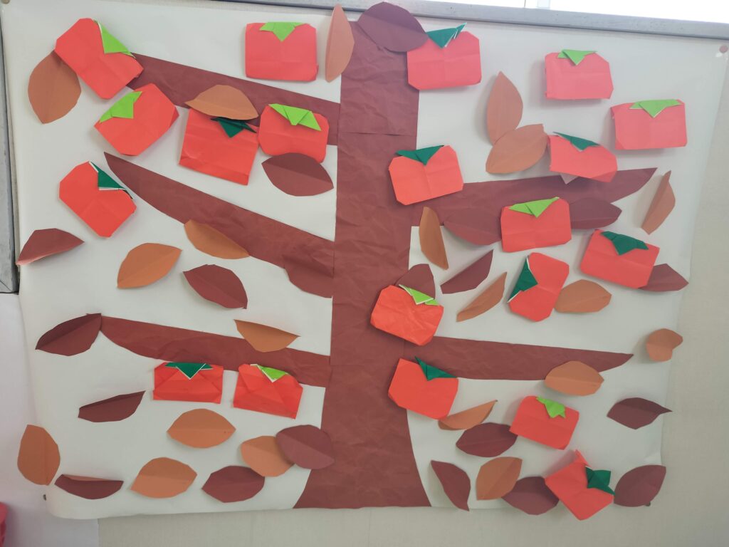 最近では折り紙を使って柿を折ったり、はさみを使って葉っぱを切りました!